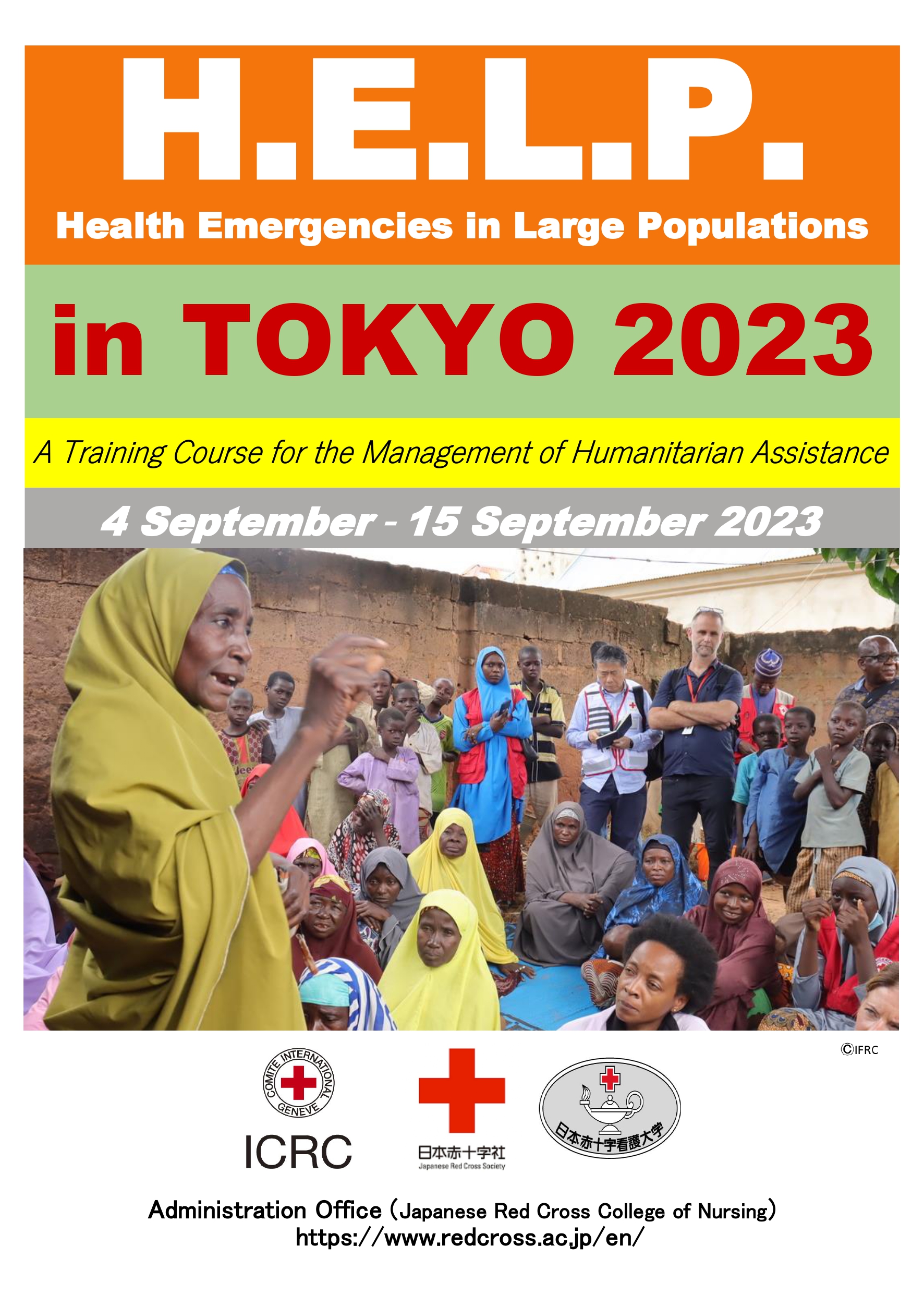 What is H.E.L.P. Course? Health Emergencies in Large Populations (H.E.L.P.) course is a two-week course on humanitarian assistance during disasters, armed conflicts and other complex crisis. It was created in 1986 by the International Committee of the Red Cross(ICRC), in partnership with The World Health Organization(WHO) and the University of Geneva, to professionalize the delivery of humanitarian assistance during emergencies, and to promote professional ethics and humanitarian principles. The course seeks to develop the knowledge, the skills and ethical standards for humanitarian work, and to fostering collaboration between the academic and humanitarian spheres. The course in Japan will be jointly organized by International Committee of the Red Cross (ICRC), Japanese Red Cross Society (JRRS) and Japanese Red Cross College of Nursing (JRCCN).