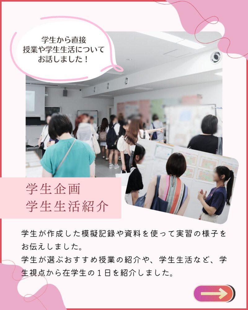 ・学生さんが話しかけて下って、相談にのってくださったり、大学生活のお話も聞けてオープンキャンパス行って本当に良かったと思いました!