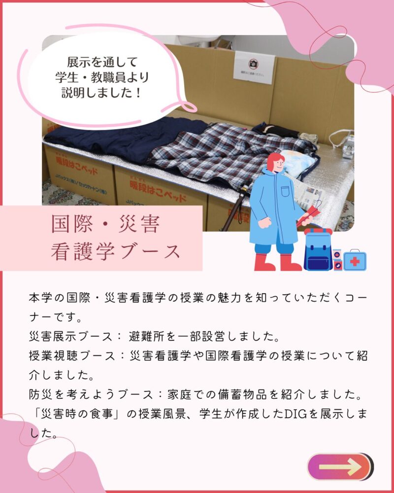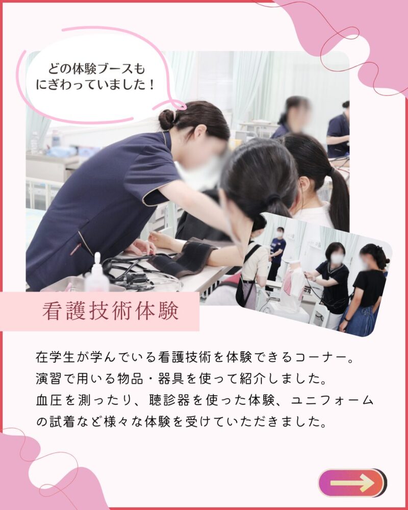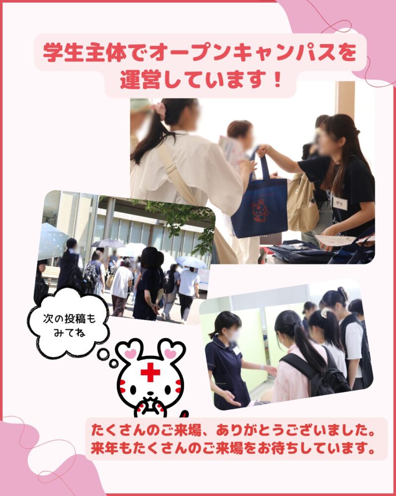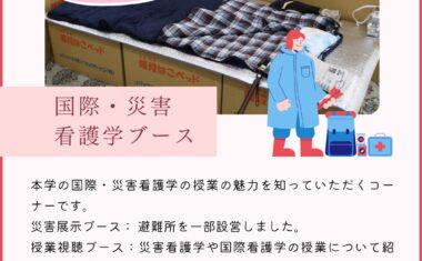・先生や生徒さんもとても優しく学校の雰囲気がとても良いなと感じました。特に災害看護について現在大学院に通っている方にお話を聞き災害看護やDMATなどに以前より興味を持つことができました。また他大学ではあまりない実習服体験などとても楽しむことができるプログラムでした。