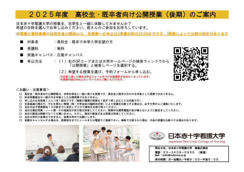 - 高校生を対象に、本学の学部授業を公開します。在学生と一緒に大学の授業を体験していただけます。